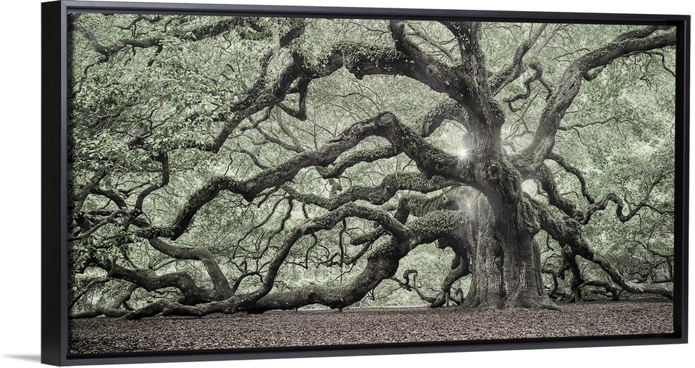 <p>An artistic photograph of a large old gnarled tree with bright green foliage and large limbs.</p>