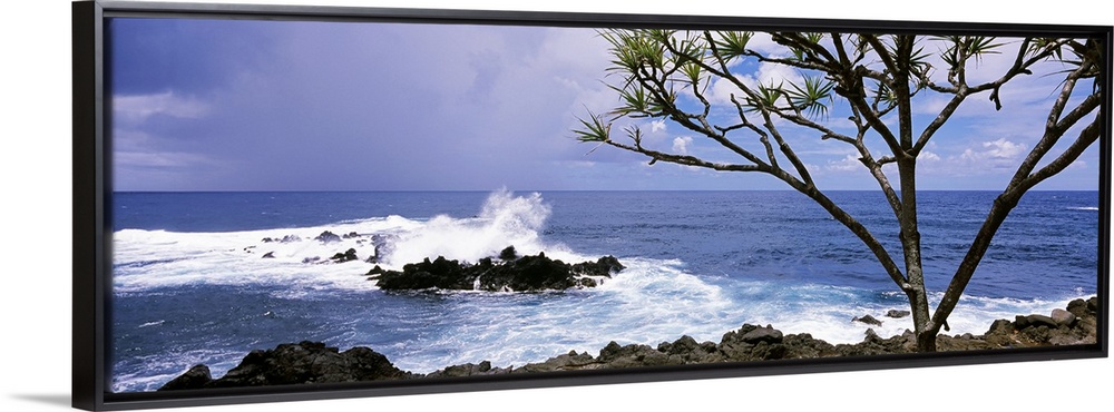 <p>Panoramic photograph of rocky shoreline with breaking waves and one tall tree under a cloudy sky.</p>