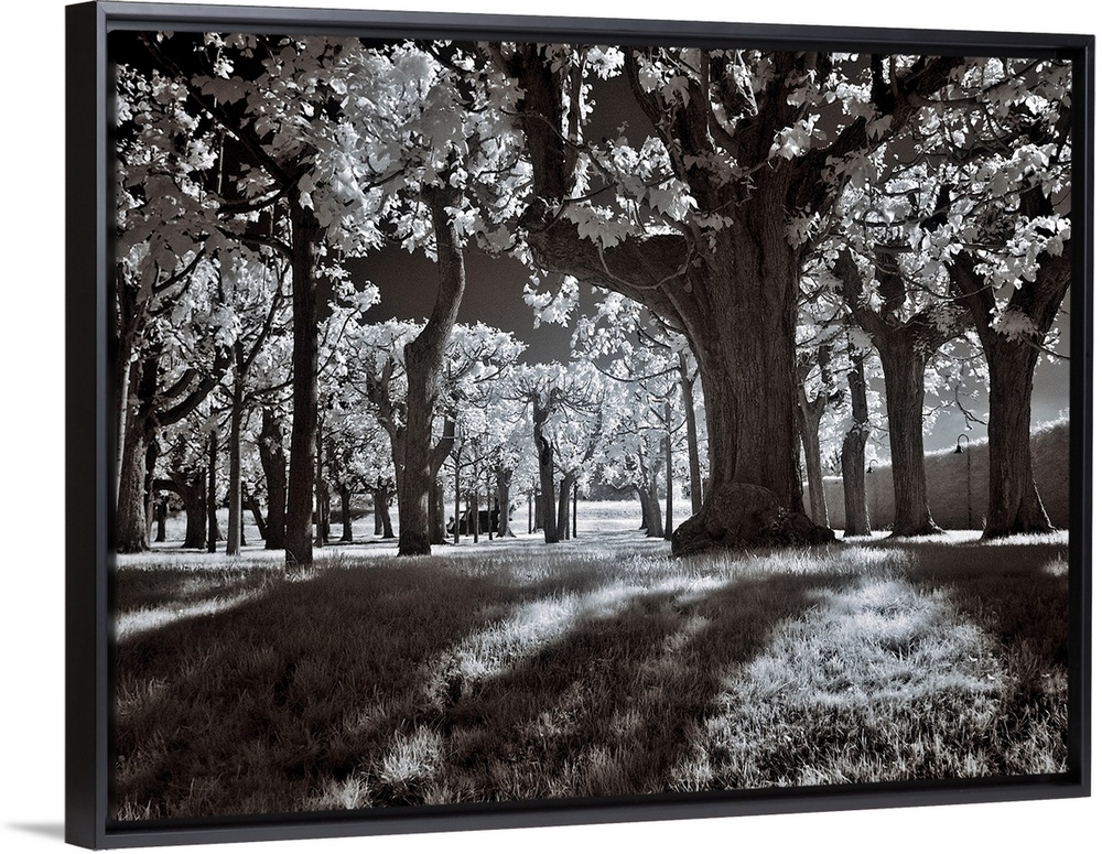 <p>A black and white infrared image of rows of trees in a park shot in a low angle from below.</p>