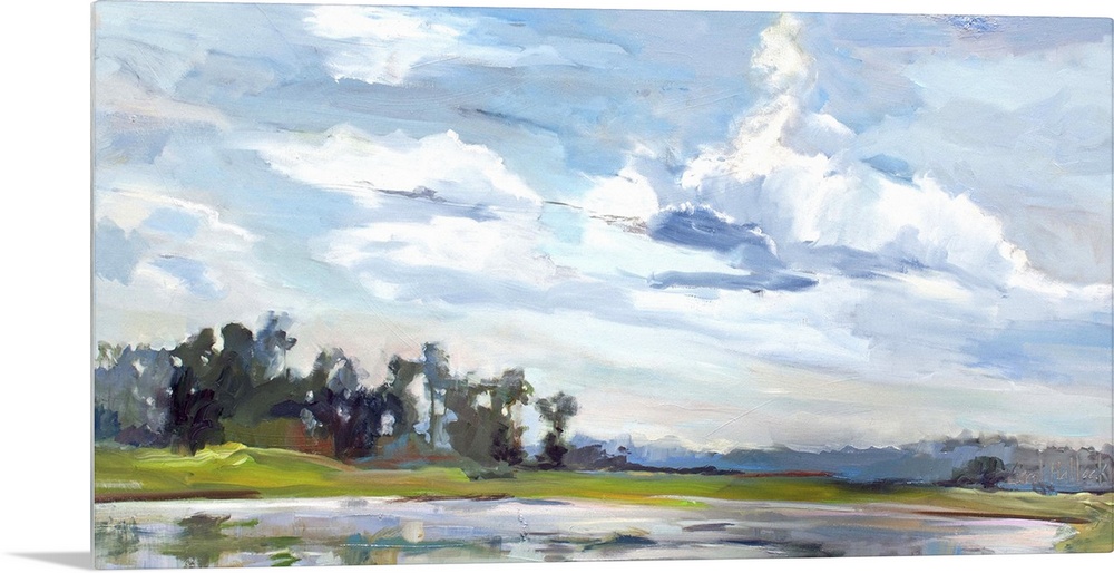 <p>A contemporary painting of a marshland under a blue sky.</p>