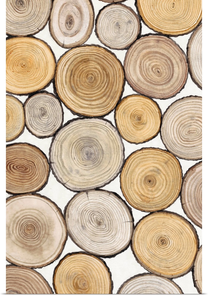 <p>Assortment of tree trunk cross-sections with prominent rings.</p>