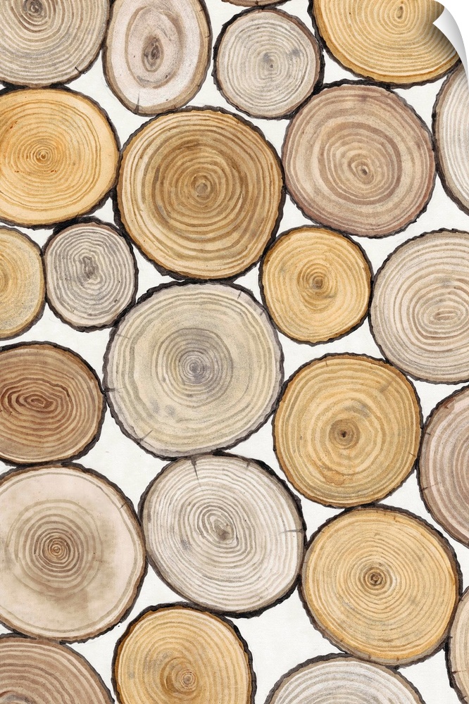 <p>Assortment of tree trunk cross-sections with prominent rings.</p>