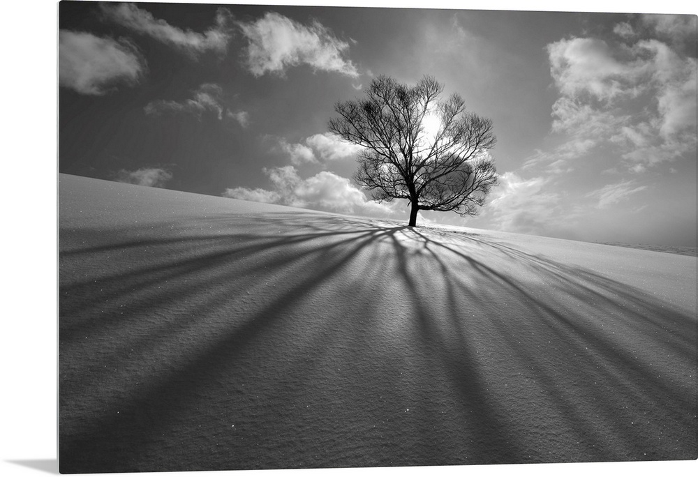 <p>A lone tree casts a long shadow stands sentinel in field of fresh untouched snow.</p>