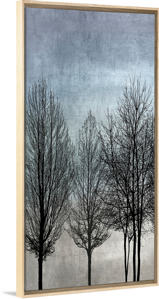 <p>Decorative artwork featuring a black silhouette of leafless trees over a distressed background.</p>