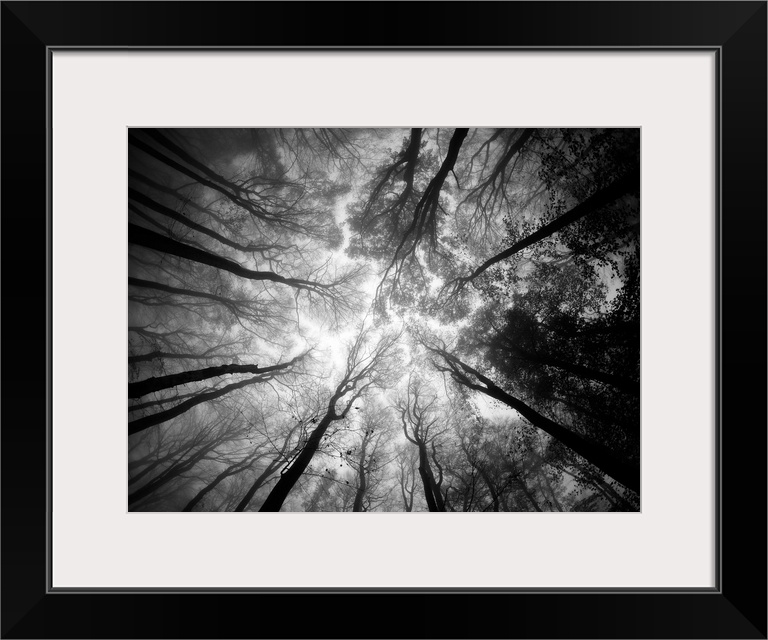 <p>Black and white image of the canopy in a forest in Slovakia.</p>