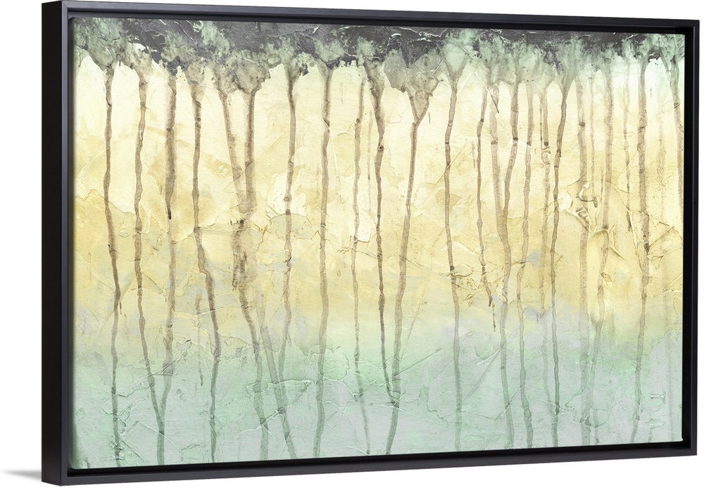 <p>This contemporary artwork features paint drips over a textured gradated background that signifies a tree line.</p>