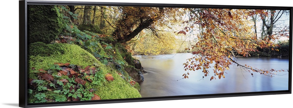 <p>Panoramic photograph displays a tree hanging over a calm waterway in the United Kingdom. Surrounding the tree is a forest thick with trees and vibrantly colored vegetation.</p>