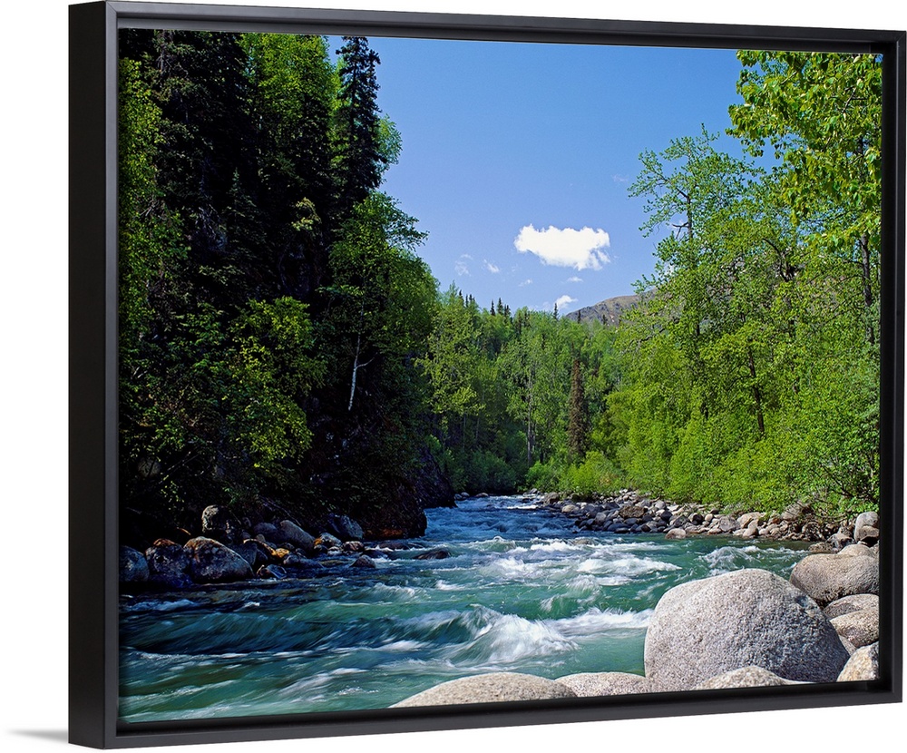 <p>A boulder filled stream courses through the wilderness surrounded by trees in this landscape photograph.</p>