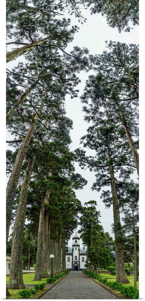 <p>Trees both sides on a path leading to a church, Sete Cidades, Ponta Delgada, Sao Miguel Island, Azores, Portugal</p>
