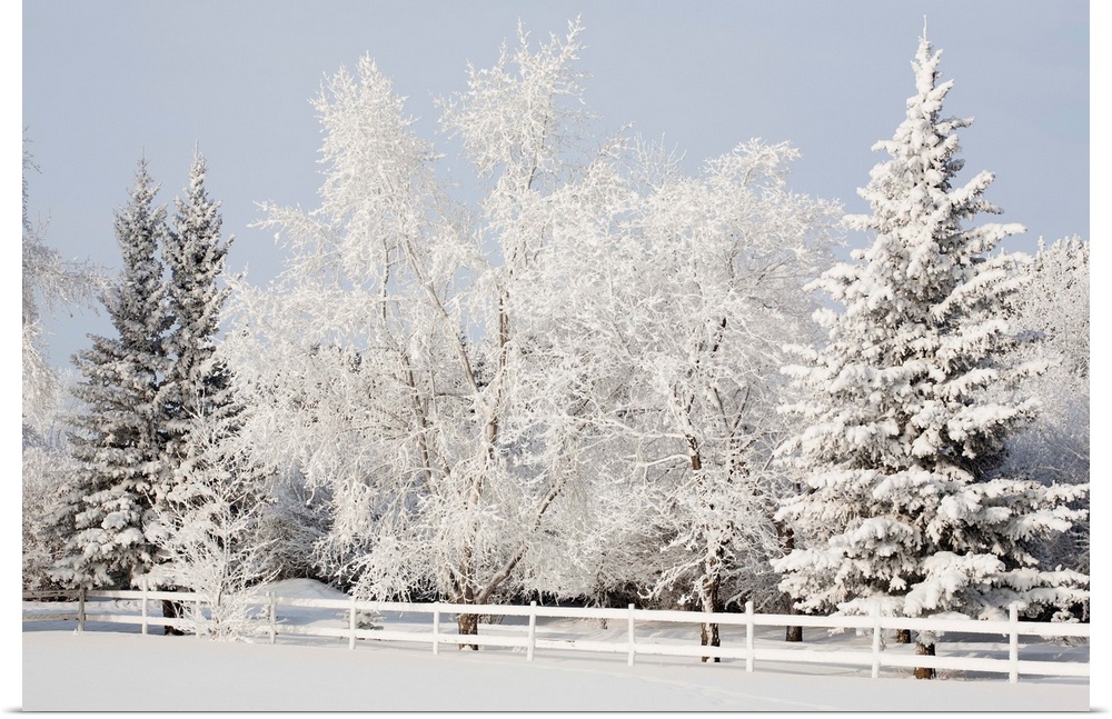 <p>A snowy scenic of a white fence and trees coated in white snow against a wintery sky</p>