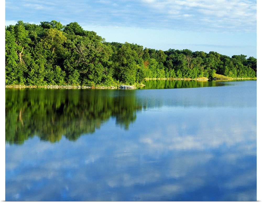 <p>Thick forest curves and lines a large body of water while reflecting in it.</p>