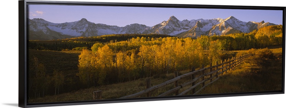 <p>Wide angle photograph on a large canvas of a wooden fence running through a golden fall landscape of Dallas Divide, the snow covered San Juan Mountains in the background, in Colorado.</p>