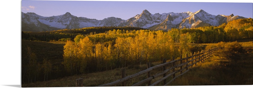 <p>Wide angle photograph on a large canvas of a wooden fence running through a golden fall landscape of Dallas Divide, the snow covered San Juan Mountains in the background, in Colorado.</p>