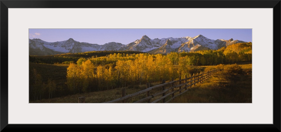 <p>Wide angle photograph on a large canvas of a wooden fence running through a golden fall landscape of Dallas Divide, the snow covered San Juan Mountains in the background, in Colorado.</p>