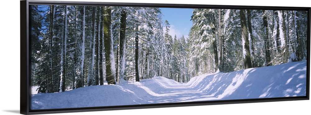 <p>Tree Lined Snow Covered Road, Winter, Crane Flat Campground, Yosemite National Park, Calfornia, USA</p>