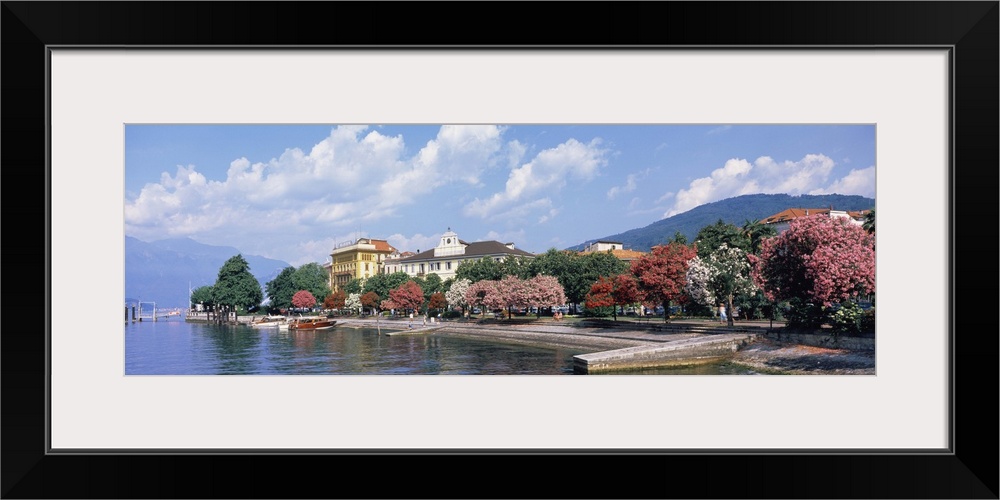 <p>Trees in blossom with houses at lakeside, Varenna, Lake Como, Lecco Province, Lombardy, Italy</p>