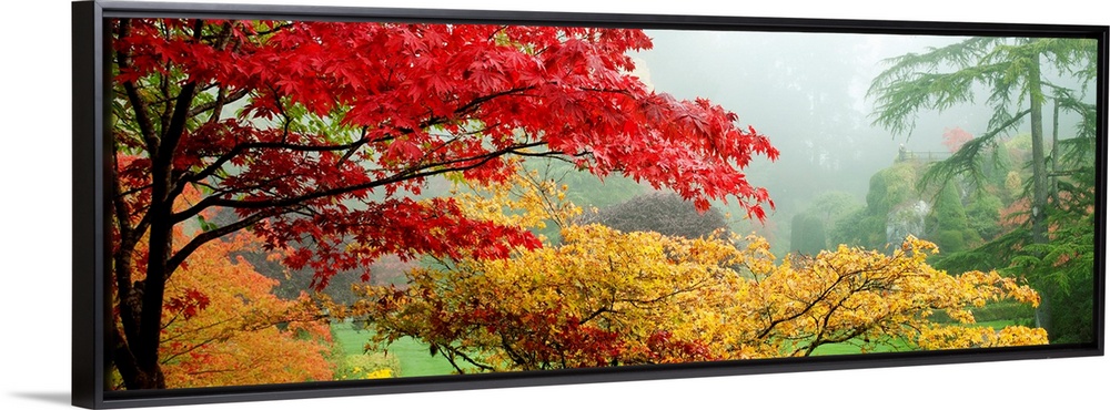 <p>Panoramic photo of brightly colored autumn leaves on trees in an Canadian garden.</p>