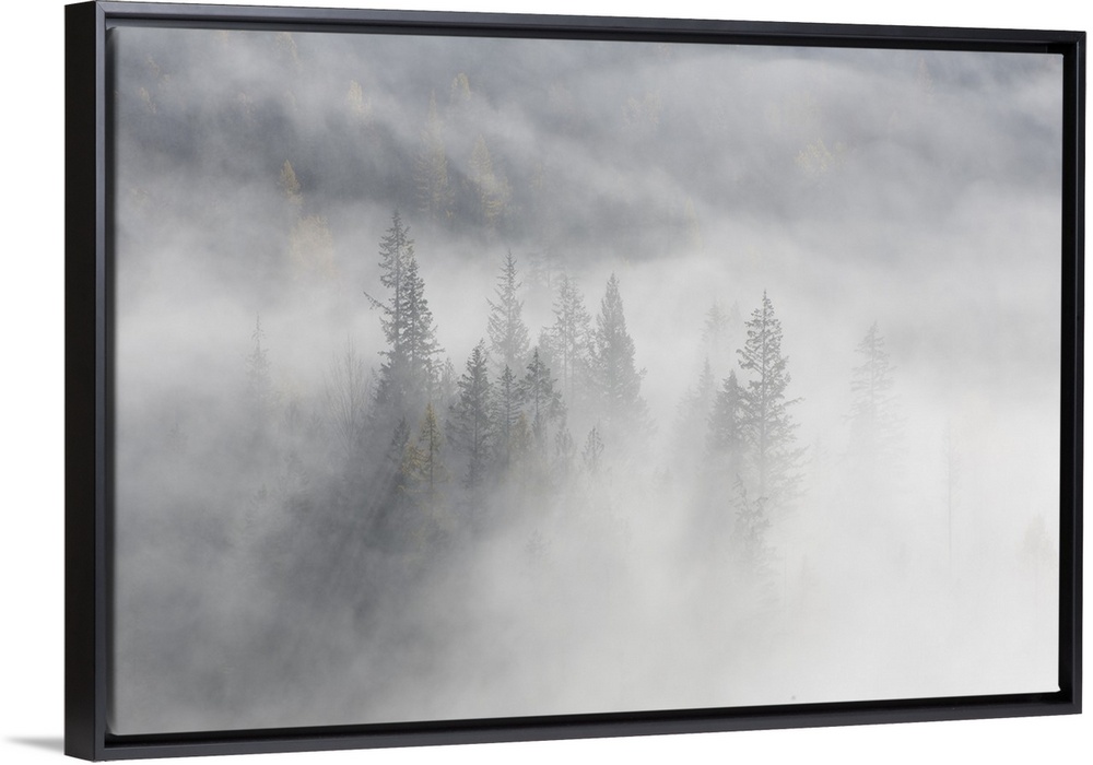 <p>A group of trees on the side of a mountain, in October (Fall), on a very foggy morning - A few larches show yellow, the rest are evergreens.</p>