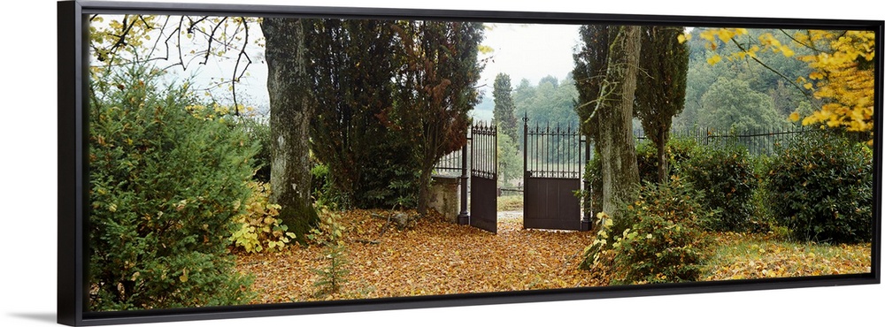 <p>An iron wrought gate is partially open in this rustic garden filled with autumn leaves in a panoramic photograph.</p>