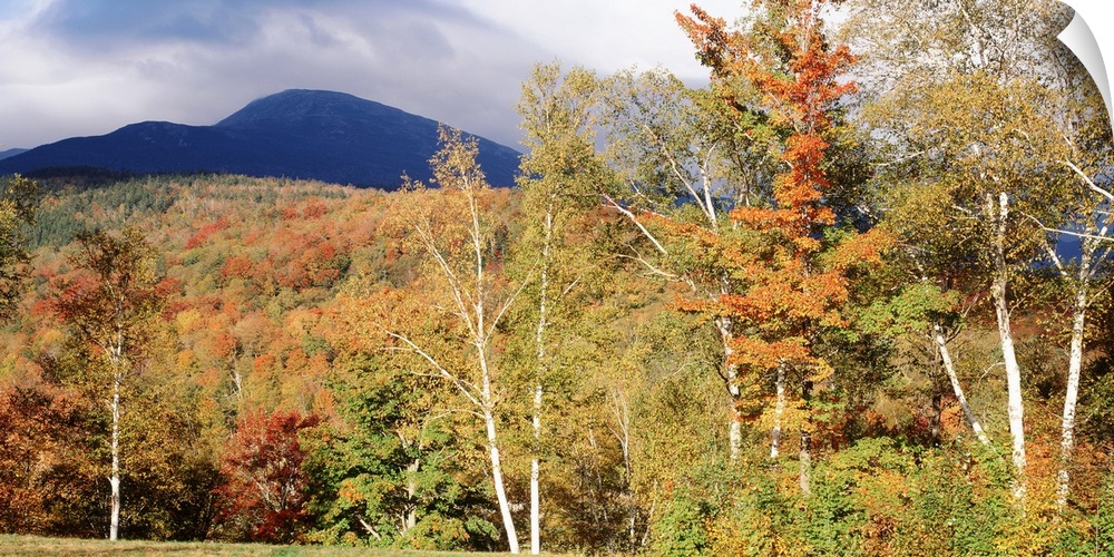 <p>Large landscape photograph of a large field of autumn colored trees in front of Mount Washington in the background, in the White Mountain National Forest, in Bartlett, New Hampshire.</p>