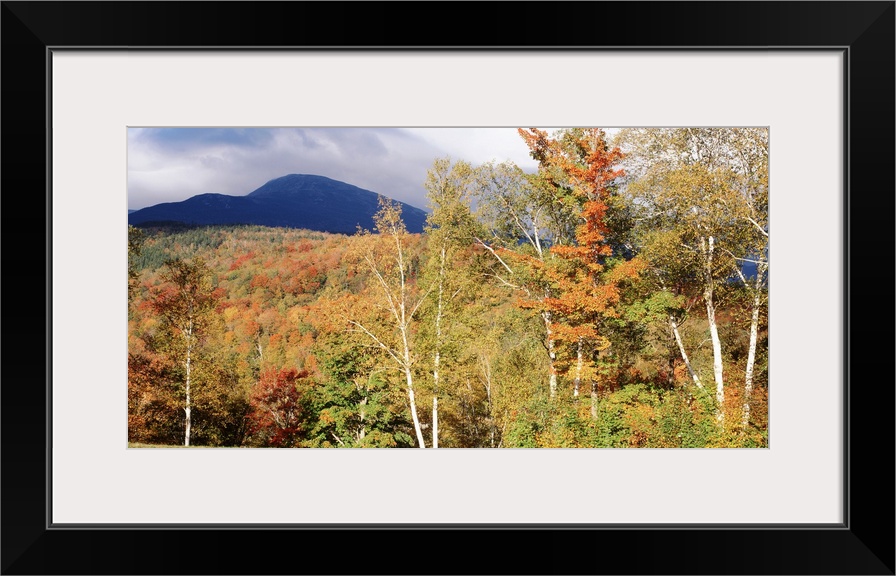 <p>Large landscape photograph of a large field of autumn colored trees in front of Mount Washington in the background, in the White Mountain National Forest, in Bartlett, New Hampshire.</p>