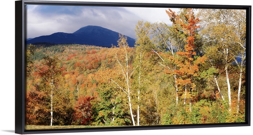 <p>Large landscape photograph of a large field of autumn colored trees in front of Mount Washington in the background, in the White Mountain National Forest, in Bartlett, New Hampshire.</p>