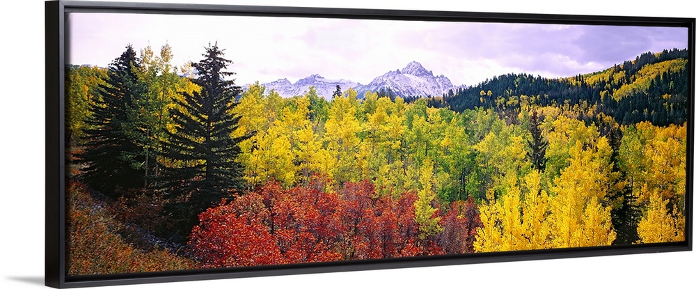 <p>Panoramic photograph displays densely filled woodlands blanketing the side of a mountain. In the background, part of a snow covered mountain range can be seen peaking above the woodlands.</p>