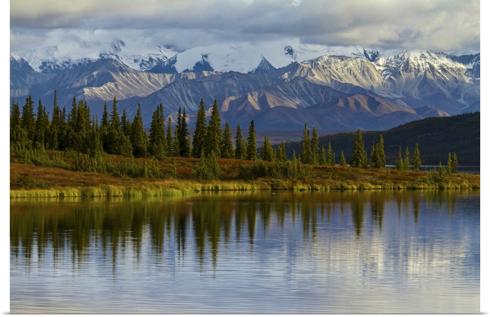 <p>Trees reflected in the surface of Wonder Lake in Denali National Park.</p>