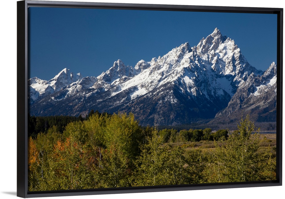 <p>Trees with mountain range in the background, Teton Range, Grand Teton National Park, Wyoming, USA</p>
