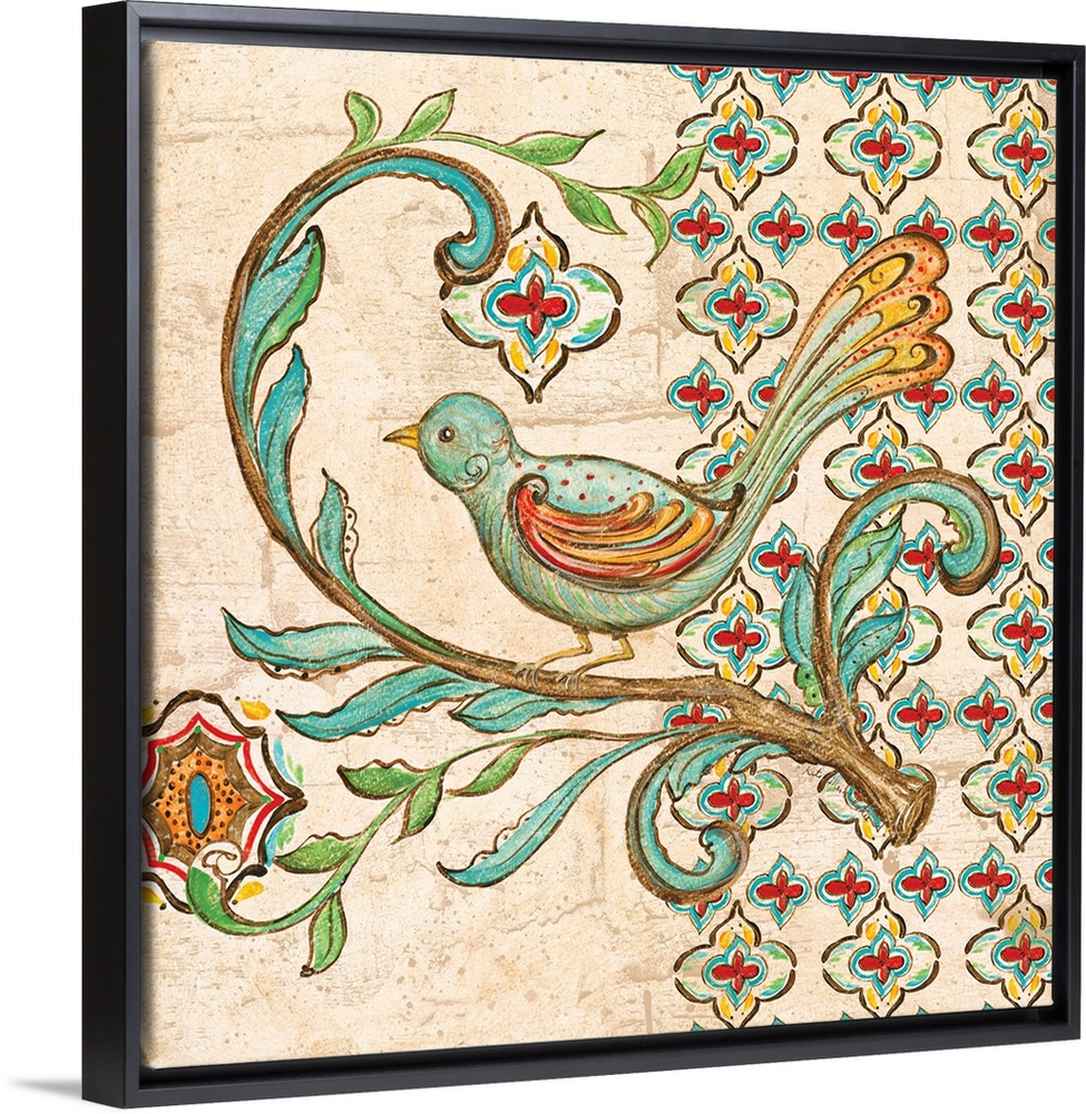 <p>Square painting of a colorful bird perched on a branch on a neutral colored background with red, blue, yellow, and brown floral designs on the right side.</p>