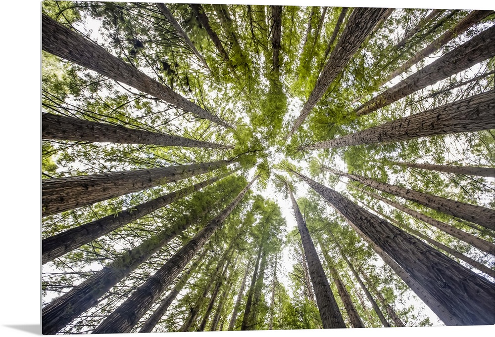 <p>Looking directly up at the treetops of the California Redwoods (Sequoia sempervirens) and sky; Beech Forest, Victoria, Australia.</p>