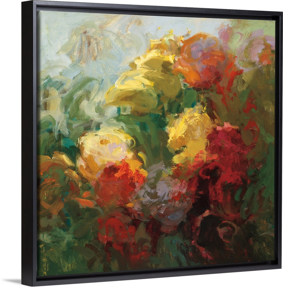 <p>An abstract floral painting in vibrant colors of red, yellow and green.</p>