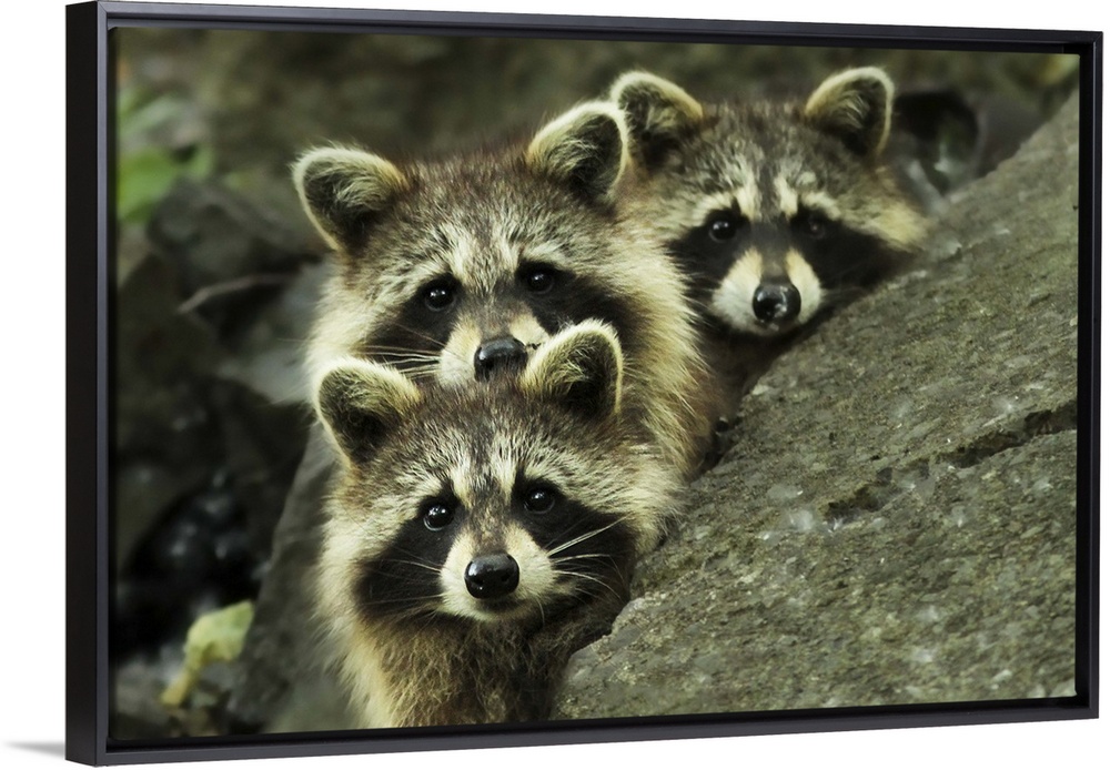 <p>The faces of three adorable raccoons peering over the edge of a rock.</p>