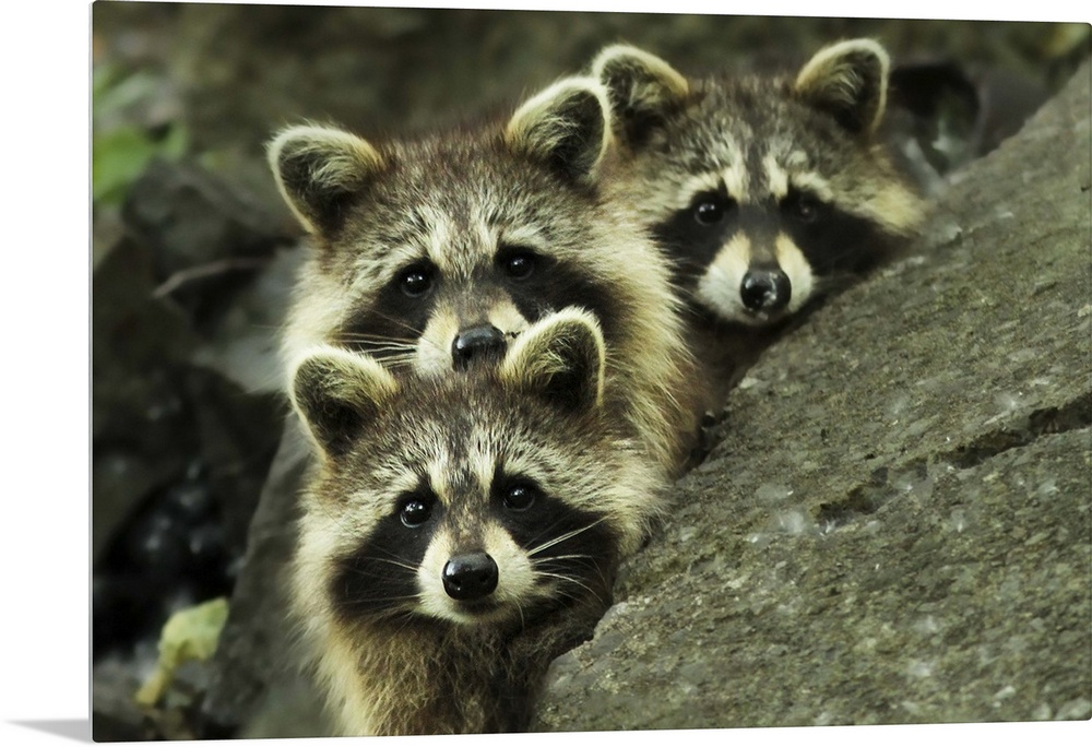<p>The faces of three adorable raccoons peering over the edge of a rock.</p>