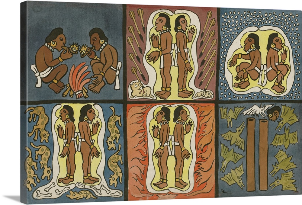 <p>Illustration by Mexican artist Diego Rivera (1886-1957) showing the trial of the Mayan hero twins Hanahpu and Xbalanque by the lords of the underworld. These trials include lances, cold, tigers, fire and bats.</p>