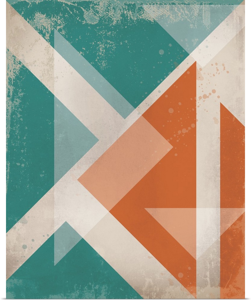 <p>Contemporary artwork of retro stylized triangles in warm and cool tones over a neutral background.</p>