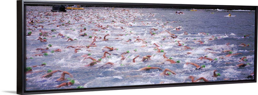 <p>Sports action photograph of hundreds of swimmers racing in the Ironman in Kailua Kona, Hawaii.</p>