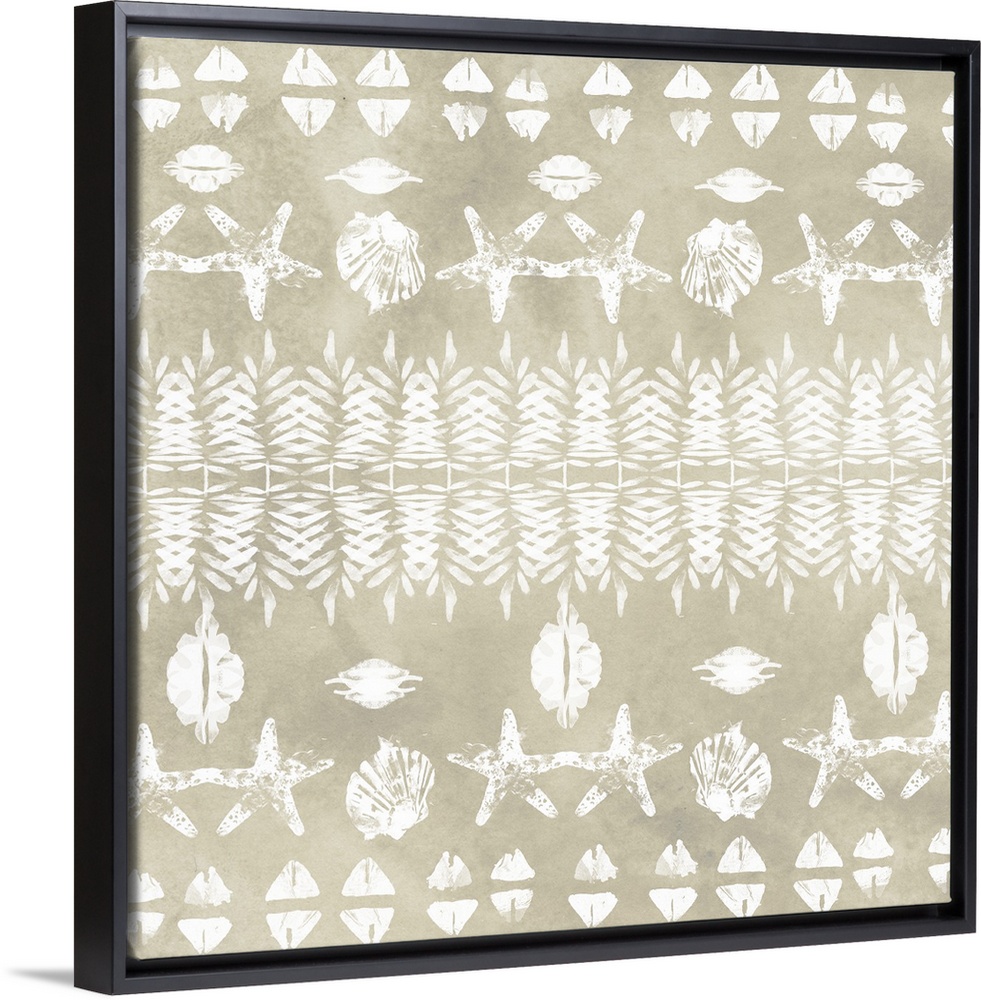 <p>White coastal illustrations resembling tribal patterns on a taupe background.</p>