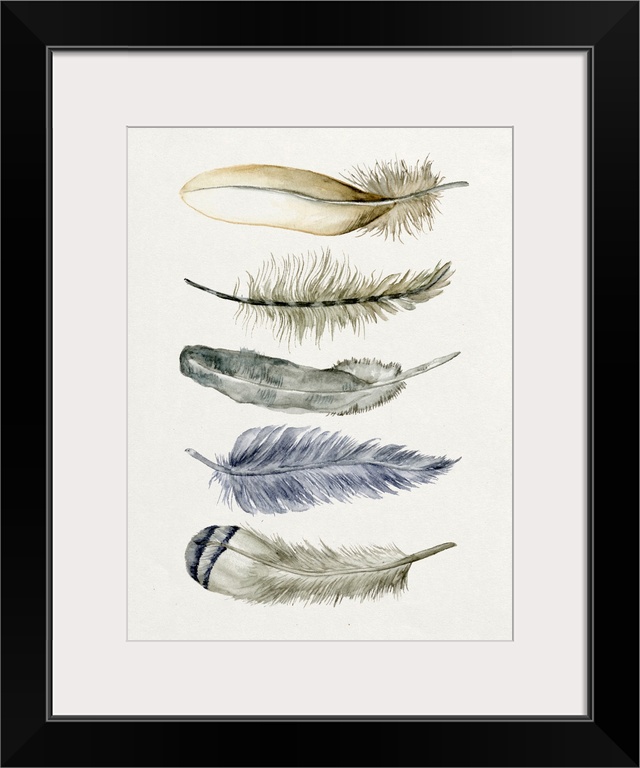 <p>Watercolor art print of five patterned feathers on beige.</p>