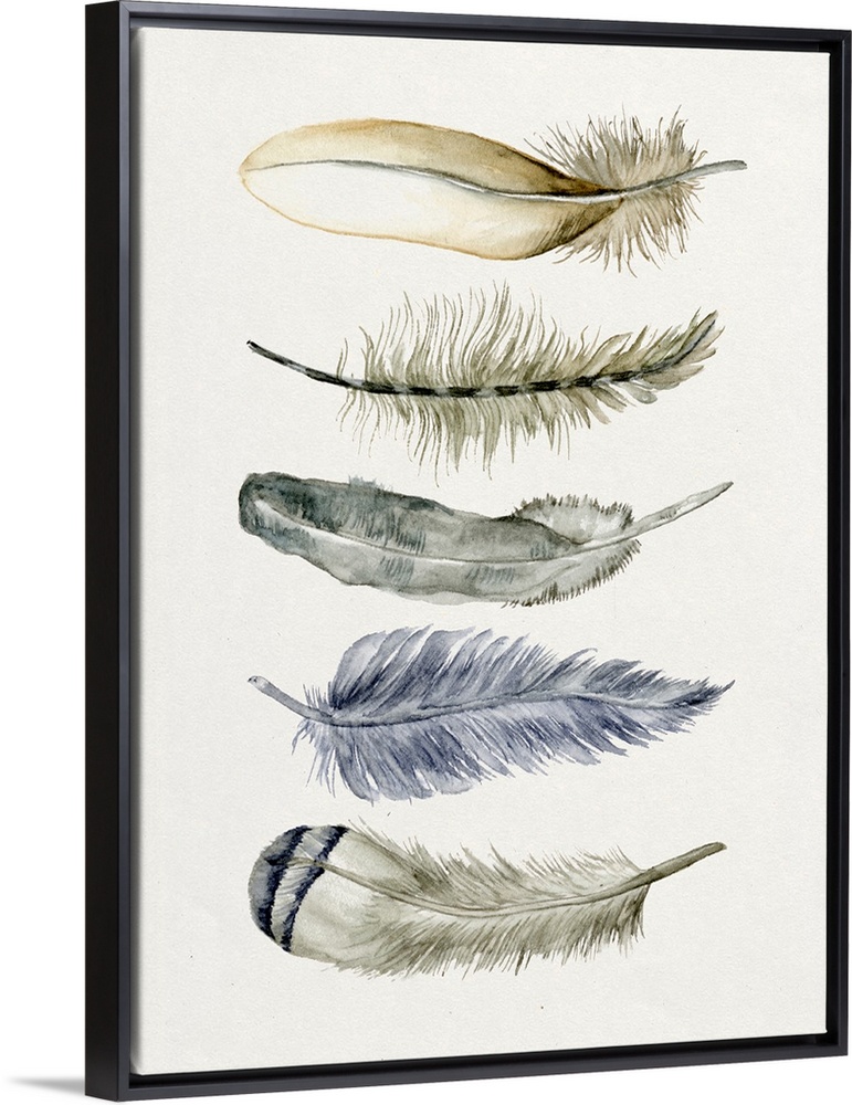 <p>Watercolor art print of five patterned feathers on beige.</p>