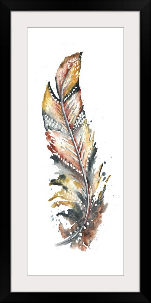 <p>A vertical watercolor design of a single feather in shades of brown and yellow with white spots.</p>