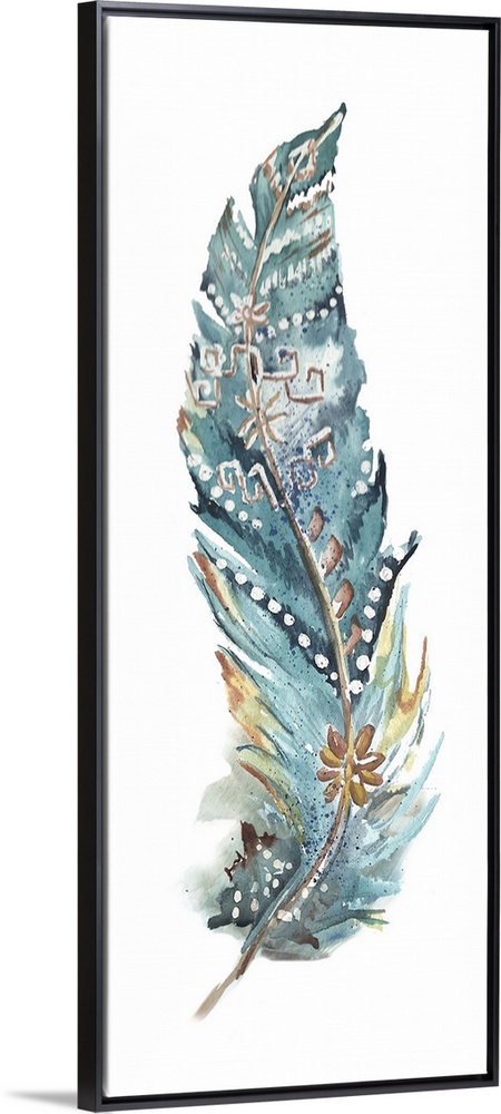 <p>A vertical watercolor design of a single feather in shades of teal and yellow with white spots and a tribal pattern.</p>
