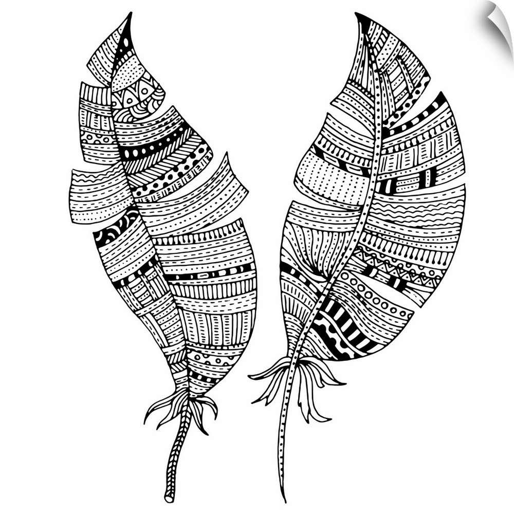 <p>Contemporary line art of two feathers with tribal patterns and designs against a white background. Perfect for Coloring Canvas.</p>