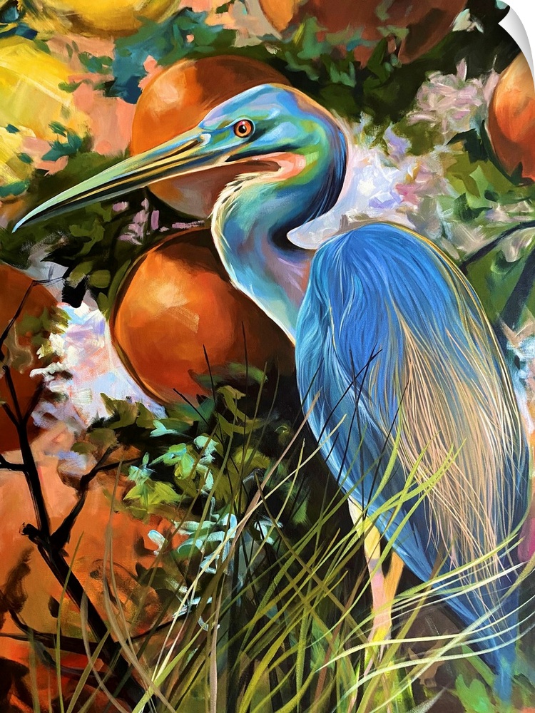 Art Coastal Blue Wall Art Contemporary Art Orange Wall Art Brook Page Painting Wildlife Bird Heron and Egret