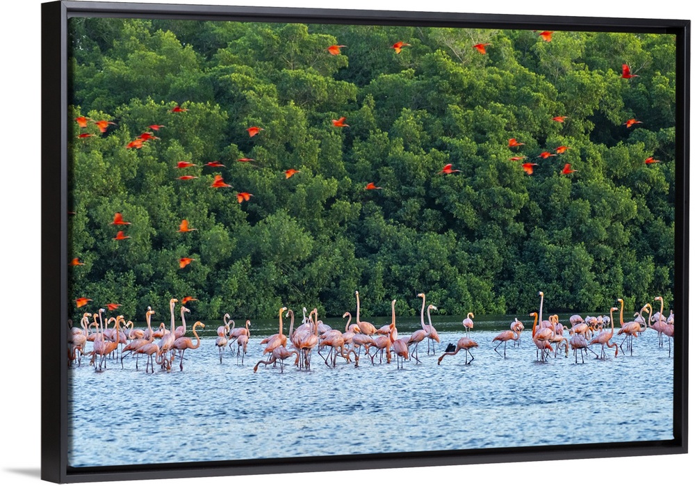 <p>Trinidad, Caroni Swamp. Scarlet ibis birds flying over American flamingos.</p>