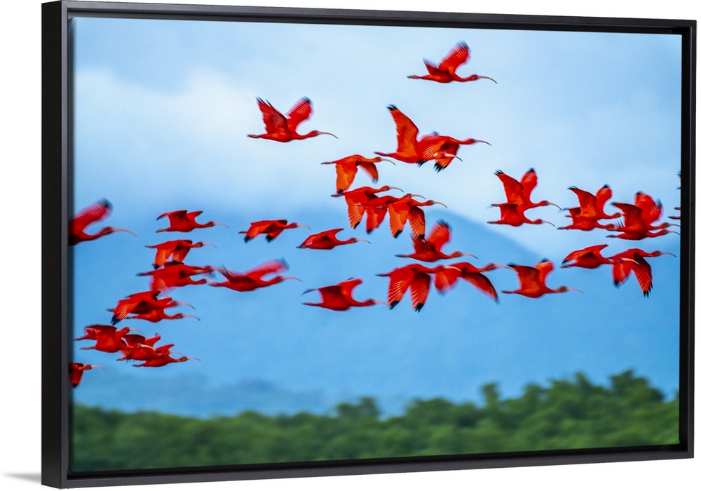 <p>Trinidad, Caroni Swamp. Scarlet ibis birds in flight.</p>