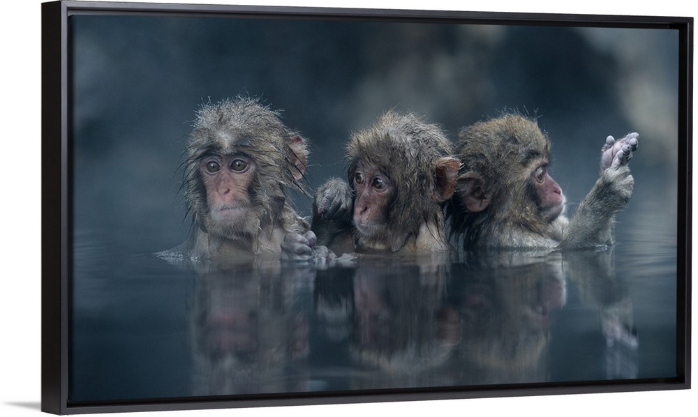 <p>Photograph of three monkeys bathing bathing in a hot spring in Japan.</p>