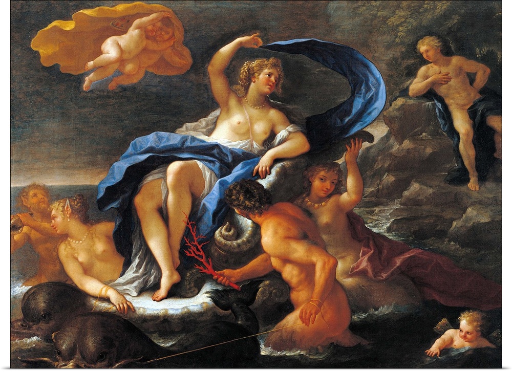<p>The Triumph of Galatea (or Venus), by Paolo De Matteis, 17th Century post -, oil on canvas, cm 177 x 228 - Italy, Lazio, Rome, Palazzo Koch, Banca dItalia Collection. All. Triumph Galatea putti rock sea drape blue fabric tissue coral chariot dolphins. (15</p>