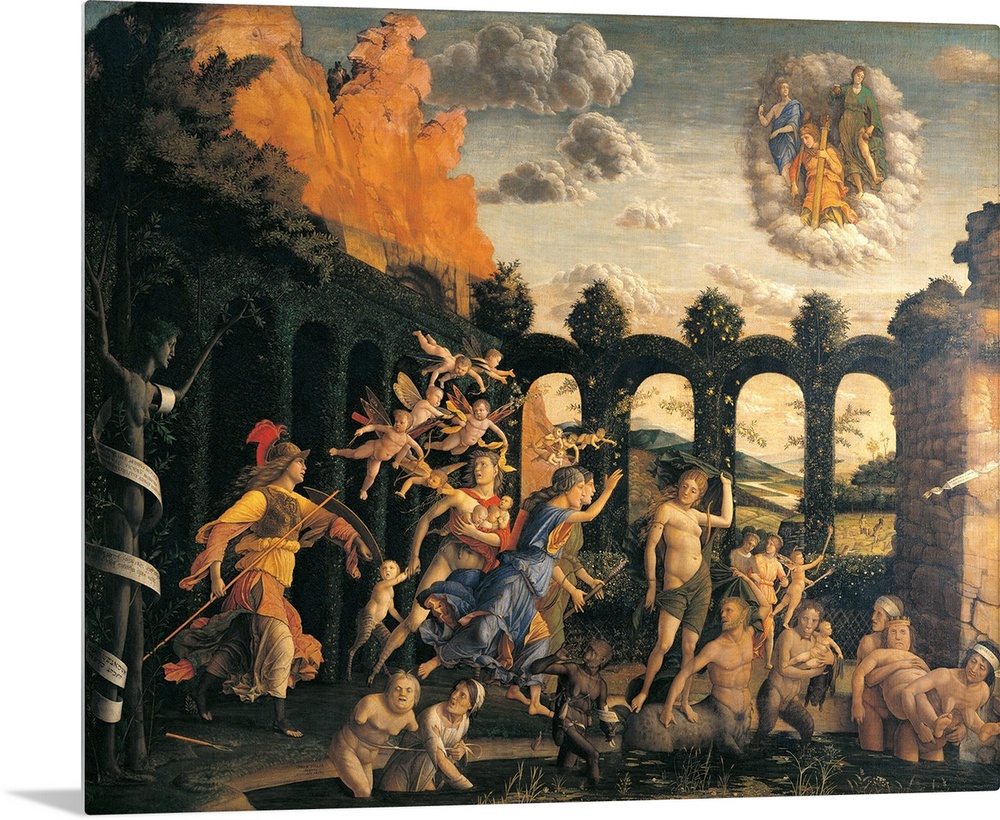 <p>Triumph of Virtue, by Andrea Mantegna, 1502 about, 16th Century, tempera on canvas, cm 160 x 192 - France, Ile de France, Paris, Muse du Louvre. All. Garden, hedge, landscape, wall, Minerva, Venus Lust, centaur, Diana, Cupid, Chastity, Idleness, Inertia,</p>