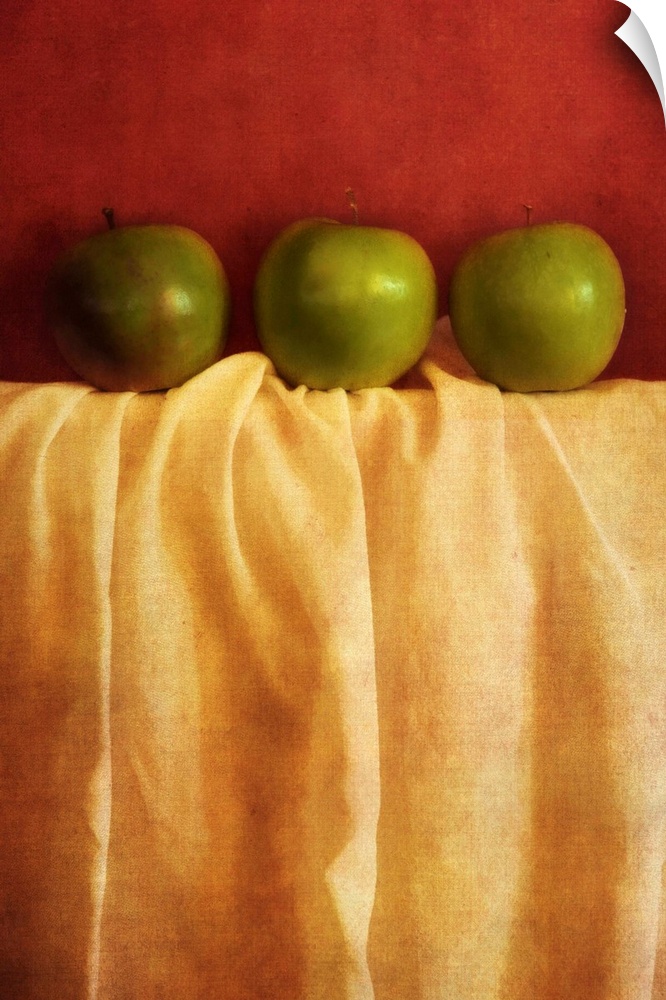 <p>Still life with three granny smith apples against red background</p>